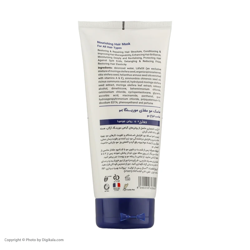 ماسک مو تغذیه کننده مورینگا مناسب انواع مو کد 2 با تامین مواد مغذی، باعث ترمیم و بازیابی خاصیت کشسانی تارهای مو شده و با افزایش نرمی و لطافت تارهای مو، موجب رفع گره و تسهیل شانهخوری موها میگردد. همچنین این محصول با رطوبترسانی موثر، باعث احیاء تارهای مو شده و از ایجاد موخوره جلوگیری میکند